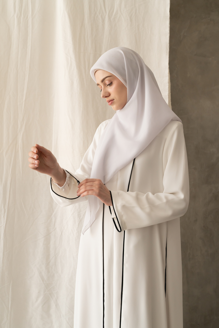 Bahan Meena anti UV kualitas terbaik, handfeel halus, lembut, flowy dan memang look nya mewah elegan nyaman di kenakan , favorit buat Umroh dan Haji karena ini tipikel paling perfect buat abaya, tidak tembus pandang, Ironless, lengan bagian dalam ADA Manset inner LAPISAN/Katun halus dengan ujung karet fleksibel memudahkan ibadah dan wudhu, aman dari singkapan dengan lengan luar lebar semi lonceng beraksen Bis manis.