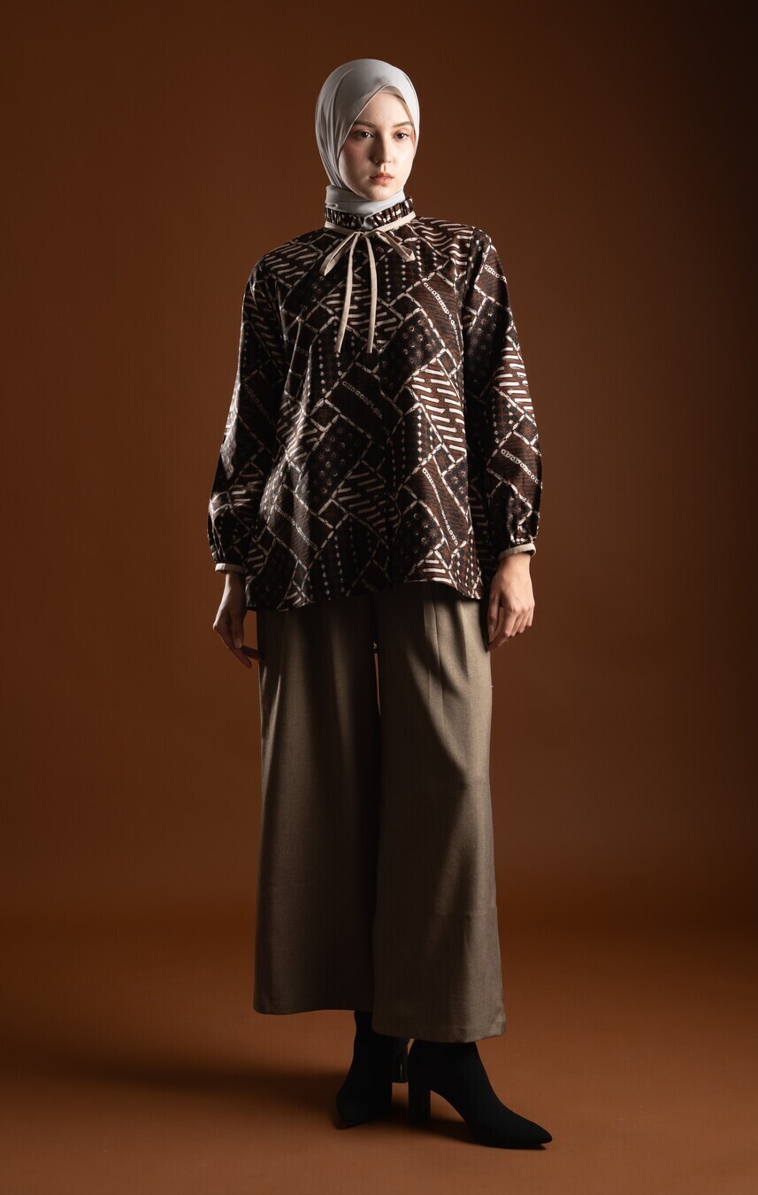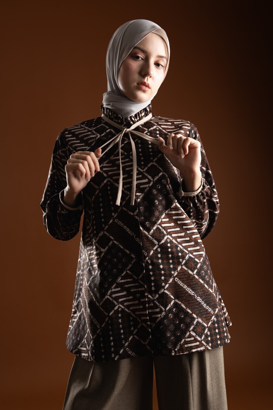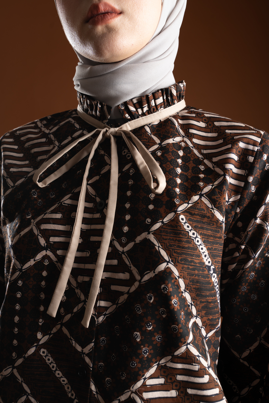 Bahan Katun Real Cotton, kualitas bagus, proses Batik Cap kombinasian tulis dengan motif warna sogan Klasik, cutting blus dengan belakang menutup baik di design lebih panjang dari bagian depan, Cutiting bawah melebar, jahitan inhouse Kalara , cocok dan muat untuk yg ber panggul besar , cutting membuat slim look, lalu detil ruffle leher dan tali pita menambah unik look, kancing bukaan depan, dan lengan wudhu friendly dengan bukaan kancing