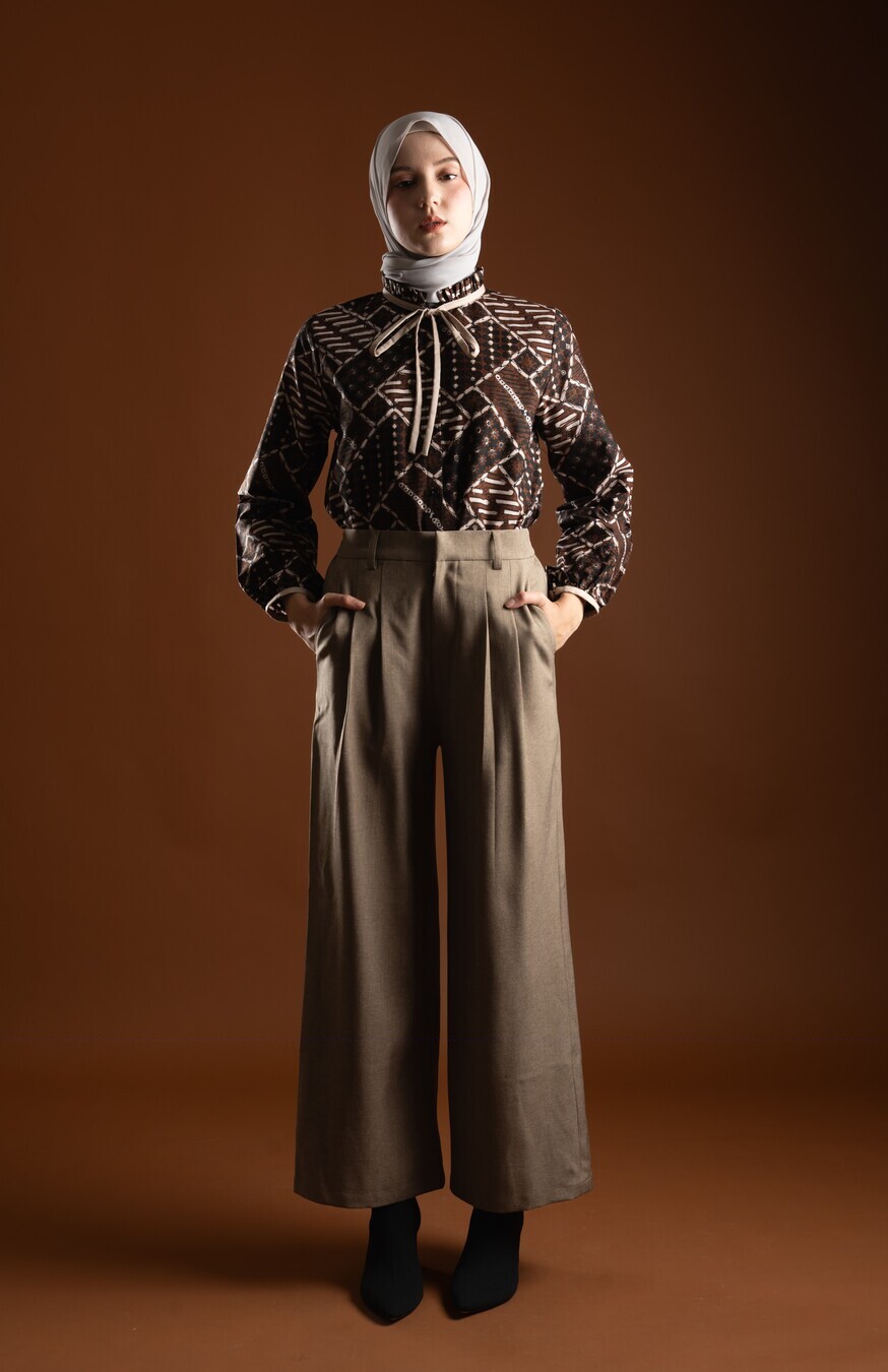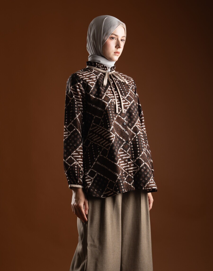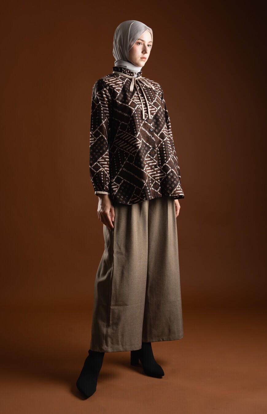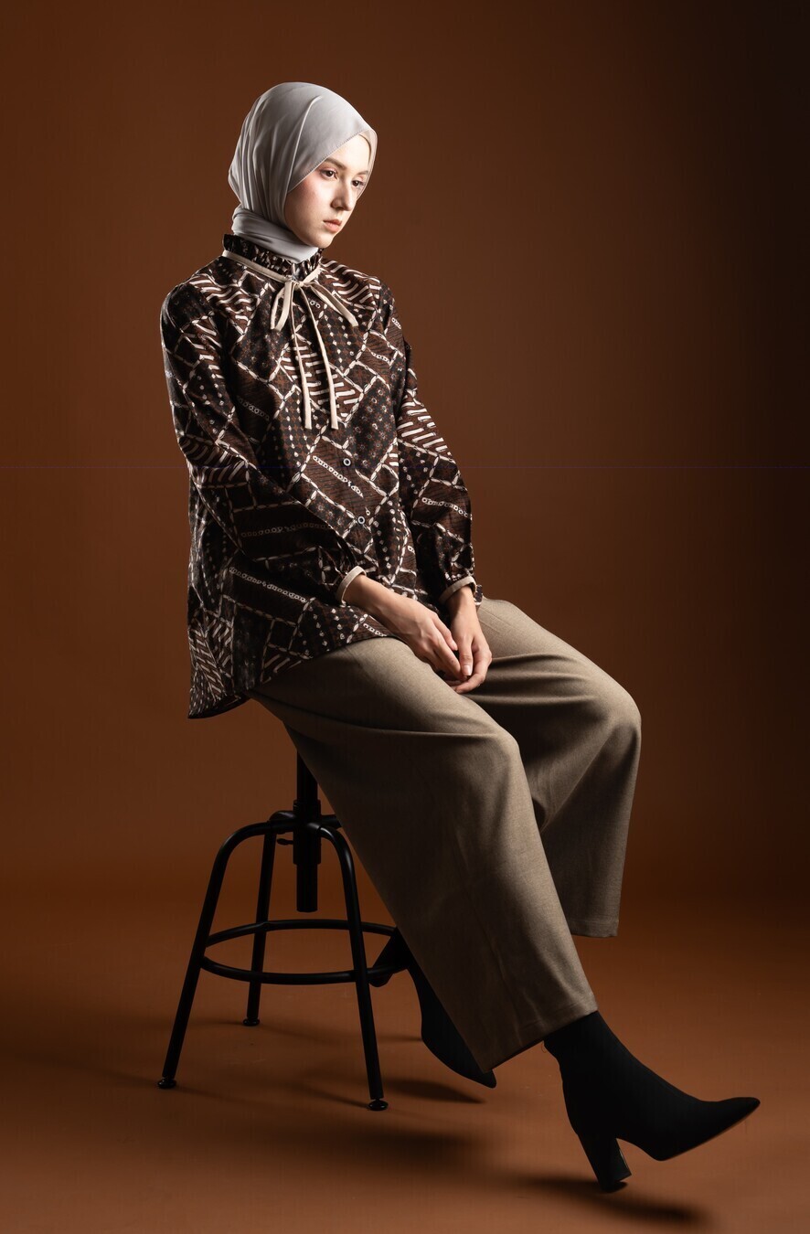 Bahan Katun Real Cotton, kualitas bagus, proses Batik Cap kombinasian tulis dengan motif warna sogan Klasik, cutting blus dengan belakang menutup baik di design lebih panjang dari bagian depan, Cutiting bawah melebar, jahitan inhouse Kalara , cocok dan muat untuk yg ber panggul besar , cutting membuat slim look, lalu detil ruffle leher dan tali pita menambah unik look, kancing bukaan depan, dan lengan wudhu friendly dengan bukaan kancing