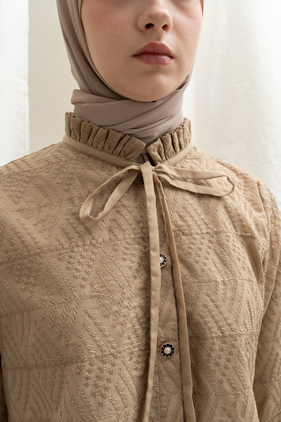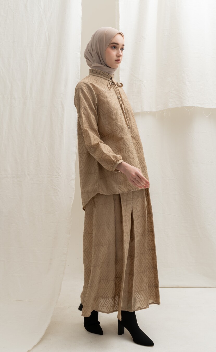 Bahan Katun Bordir klasik, motif bordiran lihat di Zoom ya, frills manis kerah dan Tali yang bisa di Pita manis, padukan dengan Deena skirt atau Yeeza Skirt , look elegan simple tapi stand out, lengan kancing bisa dibuka, wudhu friendly , kancing depan bisa dibuka / hidup. Cutting belakang lebih panjang dan melebar dibawah, super nyaman dengan cutting yang membuat slim look . Rok dibeli terpisah