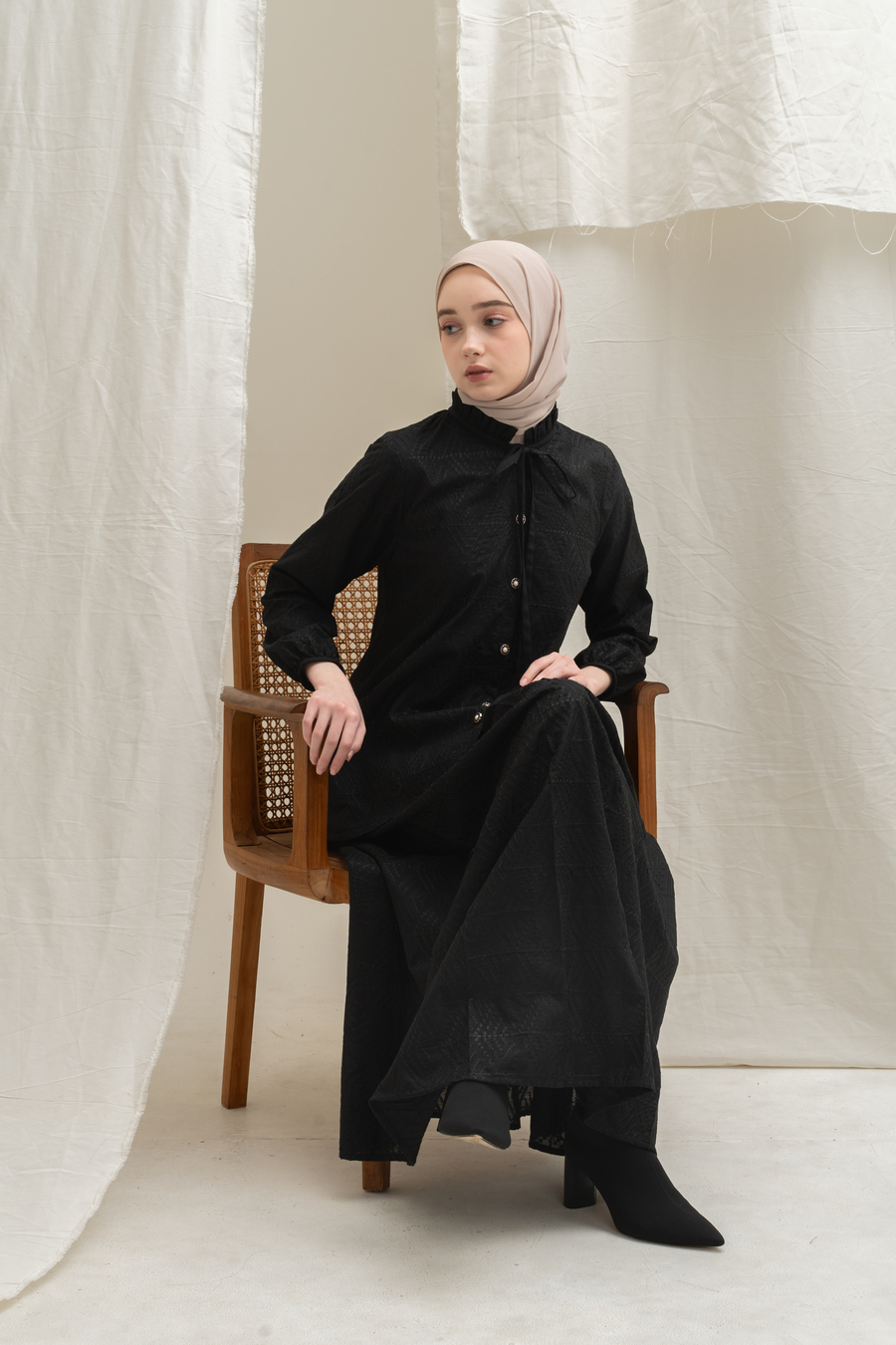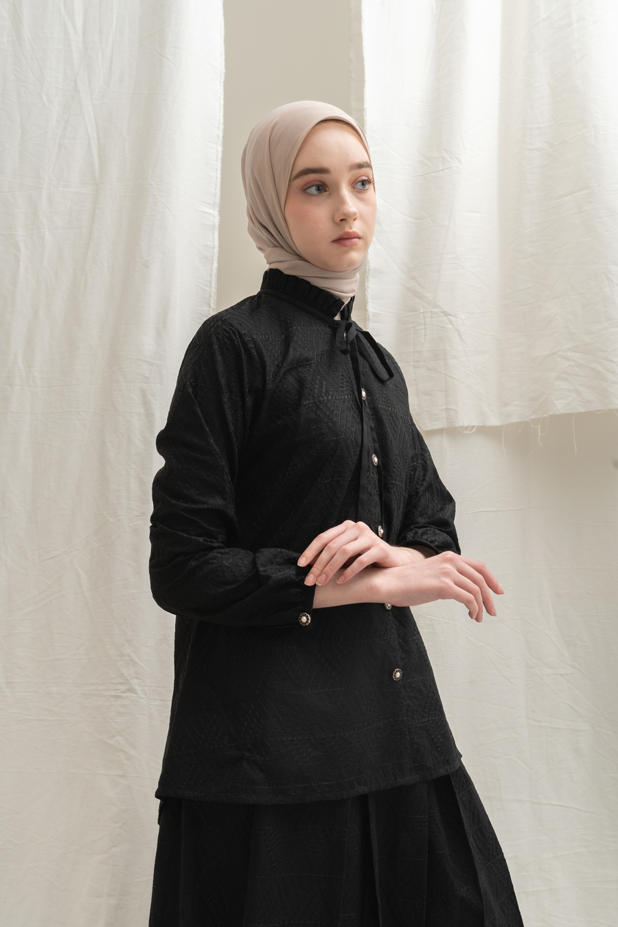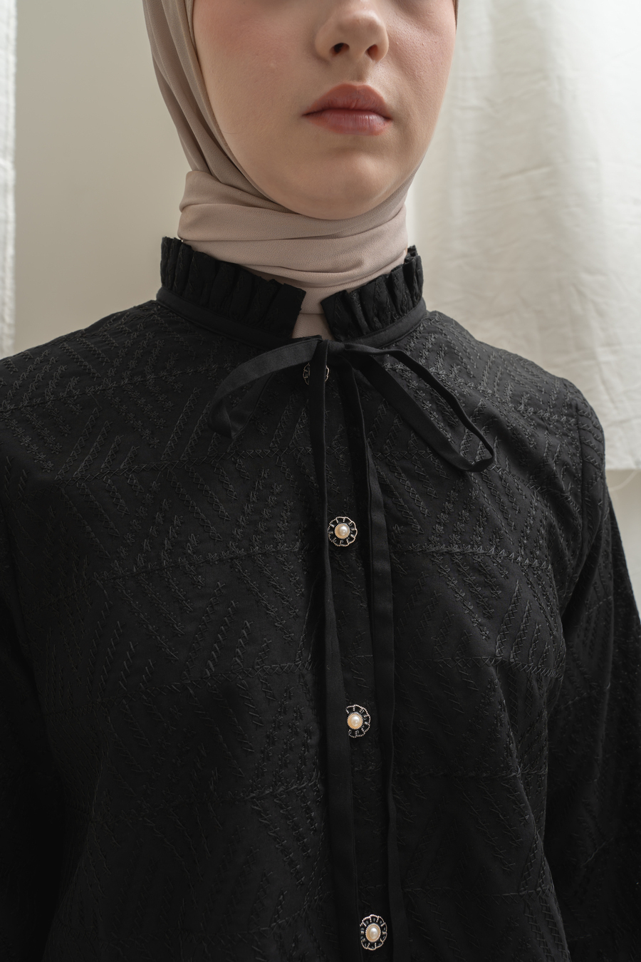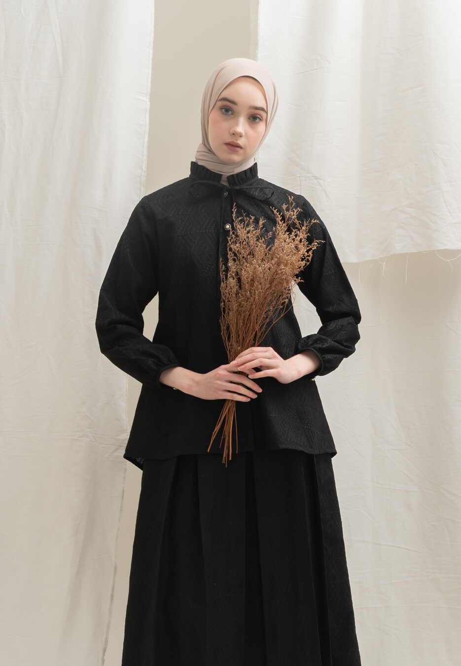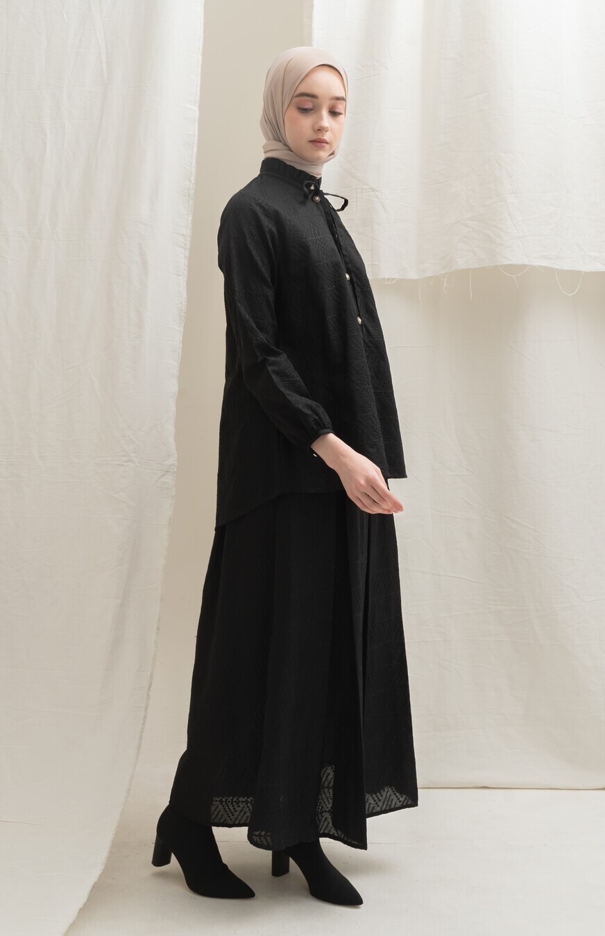 Bahan Katun Bordir klasik, motif bordiran lihat di Zoom ya, frills manis kerah dan Tali yang bisa di Pita manis, padukan dengan Deena skirt atau Yeeza Skirt , look elegan simple tapi stand out, lengan kancing bisa dibuka, wudhu friendly , kancing depan bisa dibuka / hidup. Cutting belakang lebih panjang dan melebar dibawah, super nyaman dengan cutting yang membuat slim look . Rok dibeli terpisah