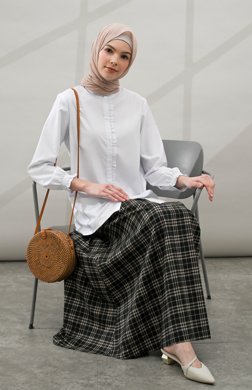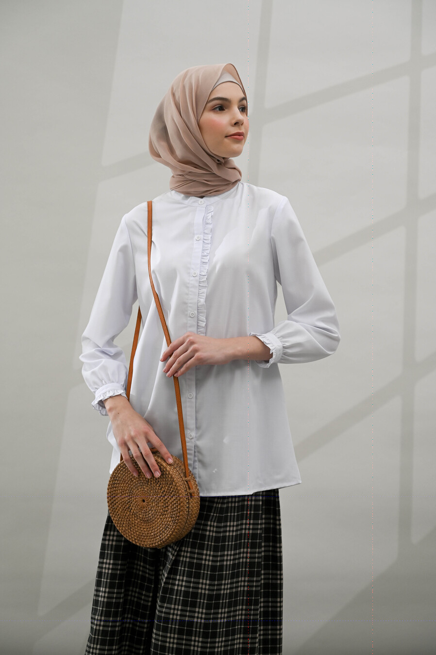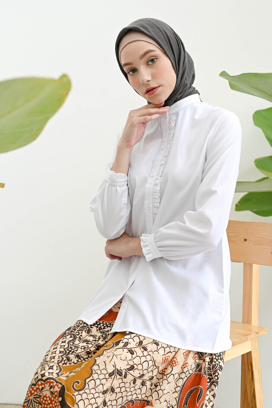 Bahan Toyobo fodu import original Tompson, handfeel super lembut, adem, menyerap keringat sangat baik, ketebalan fabric nyaman untuk daily, tipikal bahan yg awet, tidak rewel perawatan, dan makin sering dicuci malah makin nyaman, aksen frills vertikal yg dibuat dengan ketelitian dan tehnik yg advance, dibutuhkan skill jahit dengan jam terbang tinggi untuk mengerjakan piece by piecenya, aksen renda manis di manset lengan, wudhu friendly yaa, Busui friendly, kancing depan bisa dibuka semua, mix and match dijadikan outer juga bagus ini untuk casual look, jahitan inhouse dengan kehalusan pengerjaan diatas rata rata.
