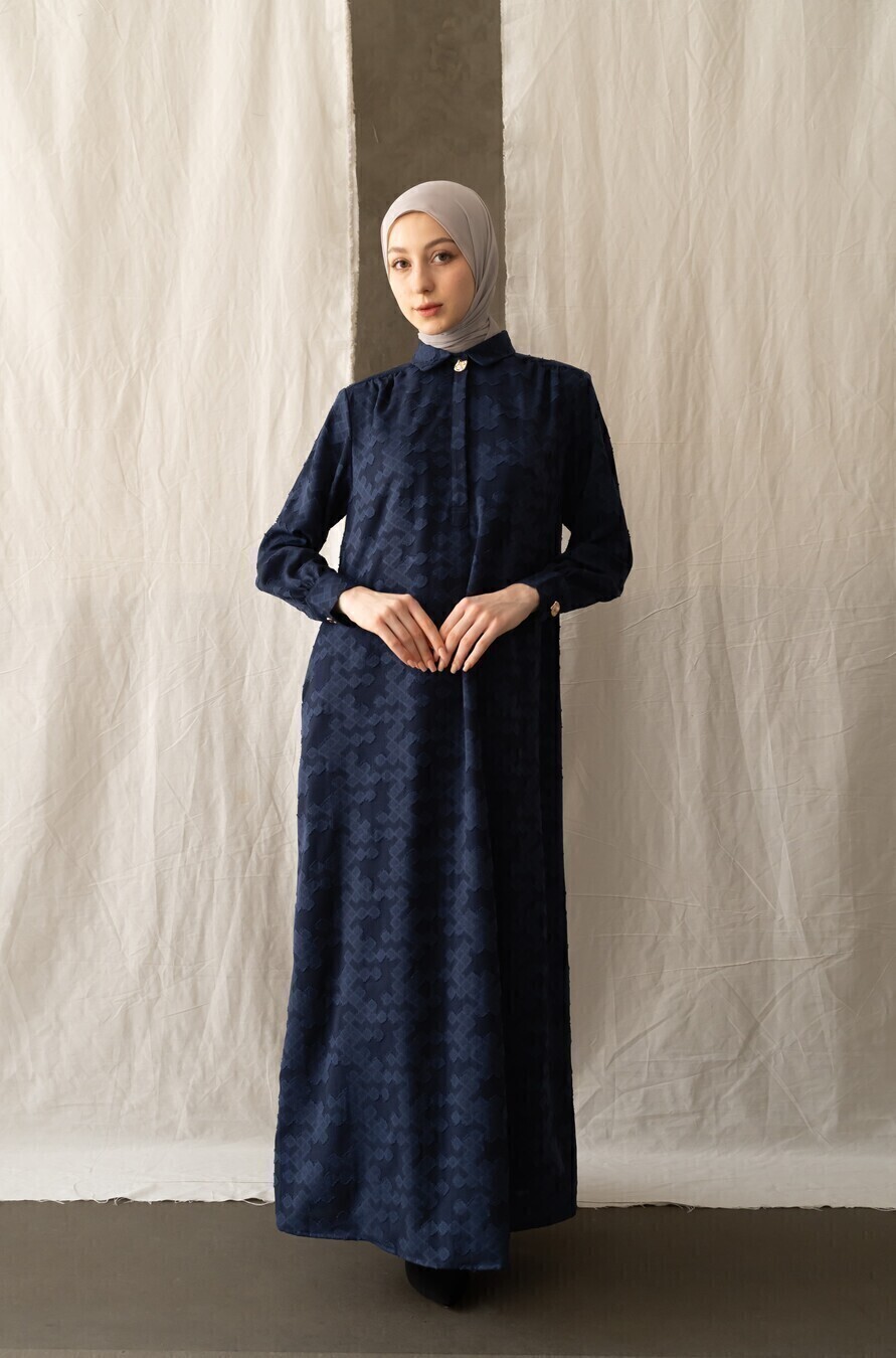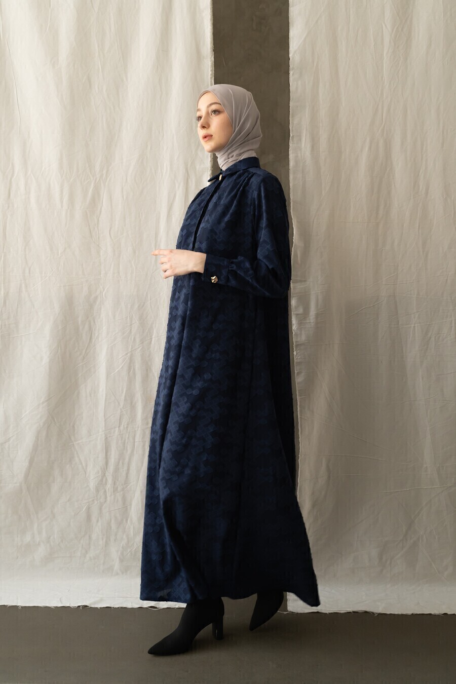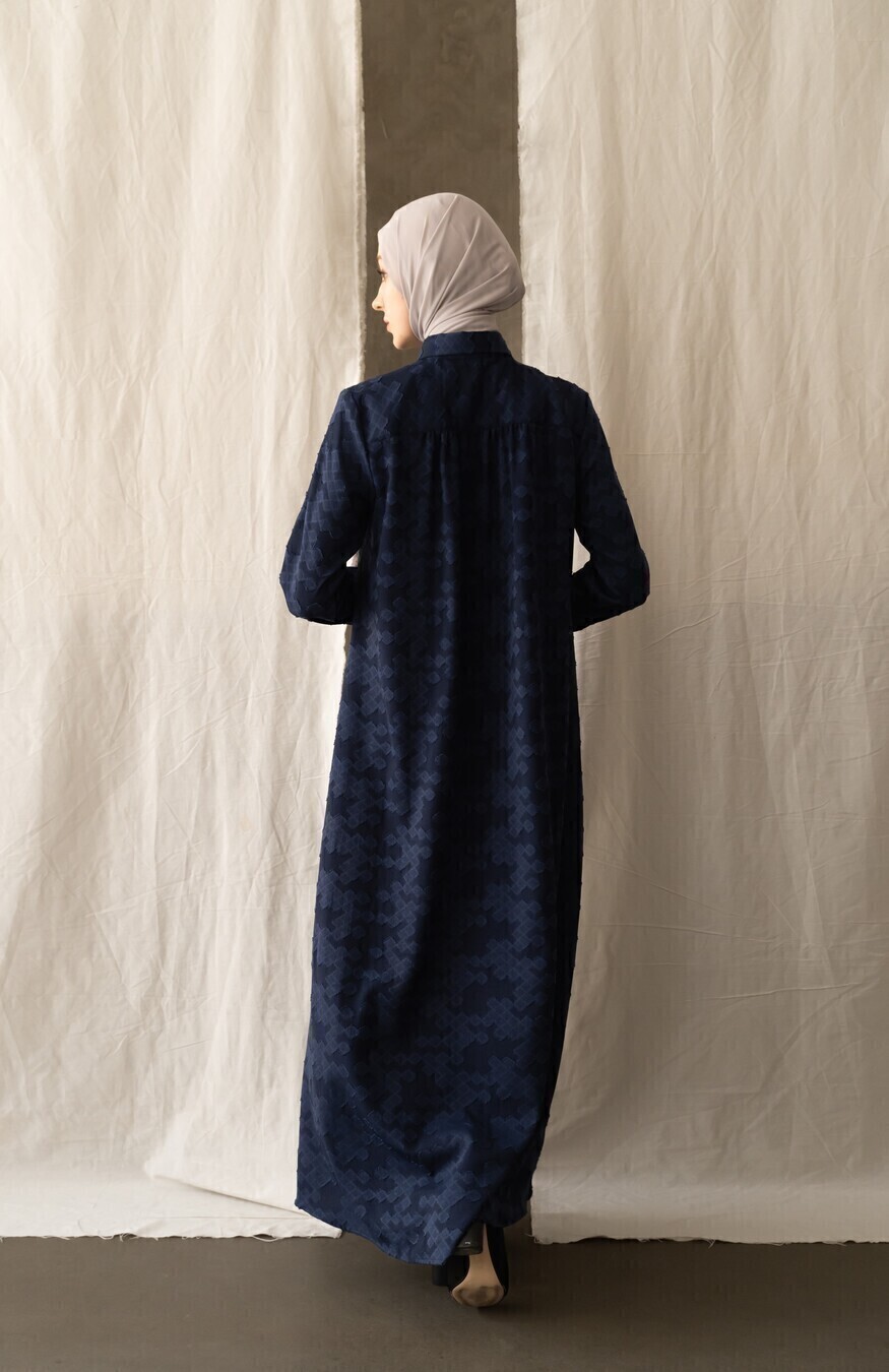 Material Kain Linen denim Jacquard dengan tekstur Uragiri unik, cutting dress A line dengan bukaan depan kancing sembunyi /hiden button, lengan wudhu friendly, silhouete feminine , terdapat saku sisip kanan, lipit depan dan belakang dengan detil kerah yang stand out.