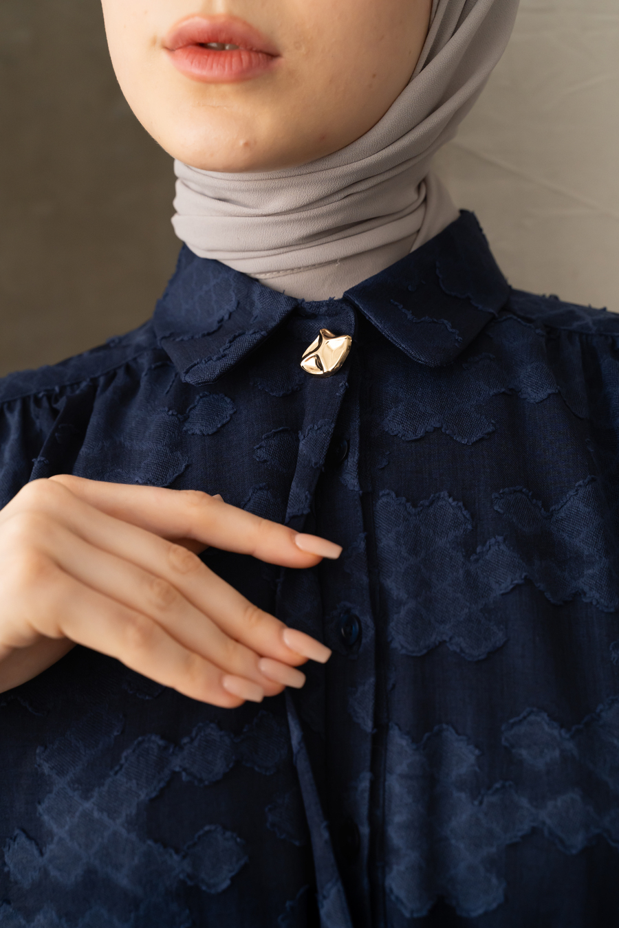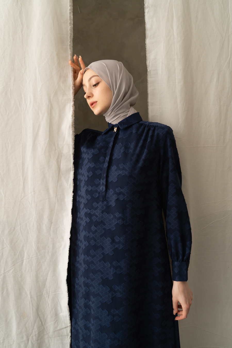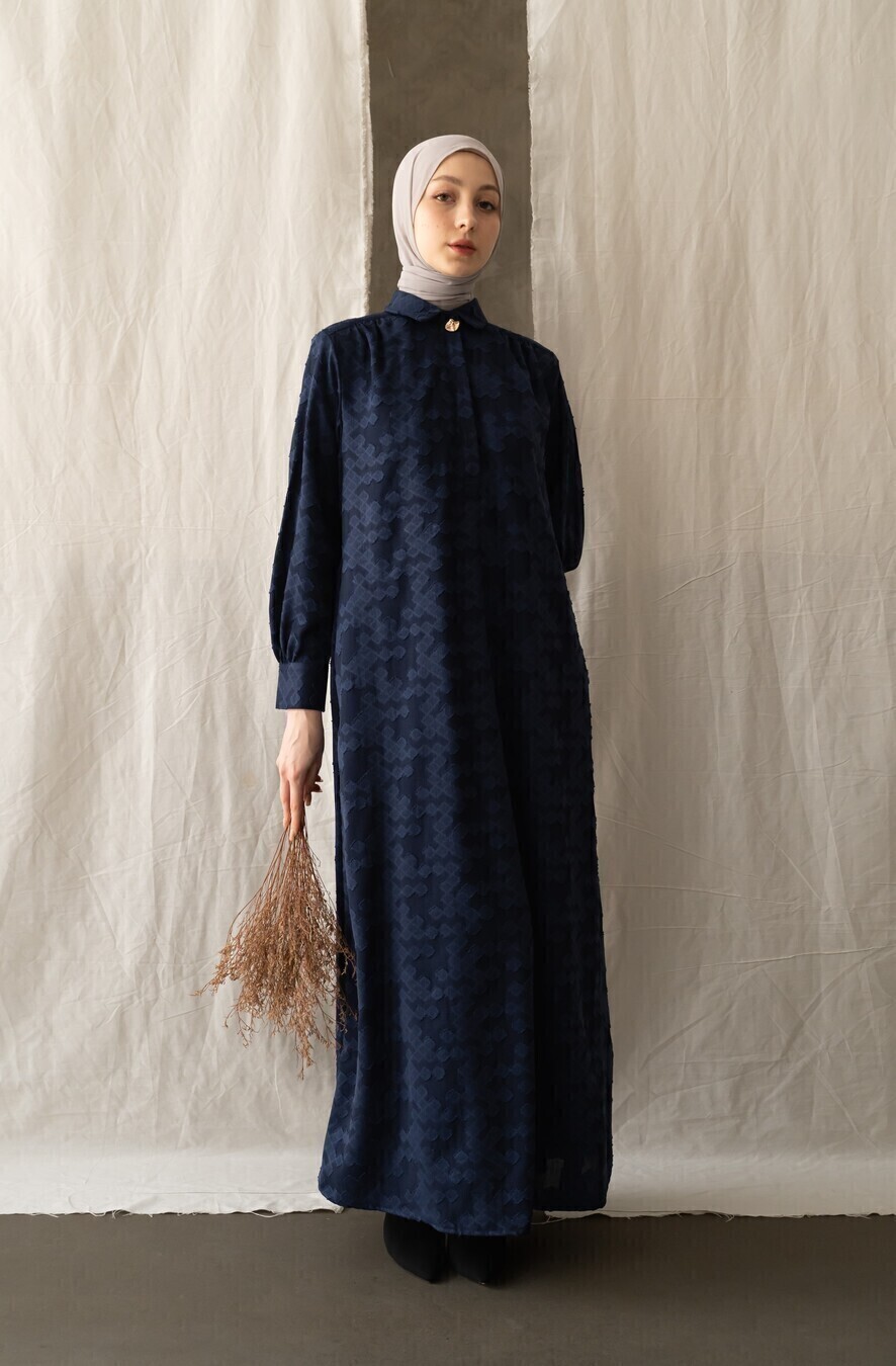 Material Kain Linen denim Jacquard dengan tekstur Uragiri unik, cutting dress A line dengan bukaan depan kancing sembunyi /hiden button, lengan wudhu friendly, silhouete feminine , terdapat saku sisip kanan, lipit depan dan belakang dengan detil kerah yang stand out.