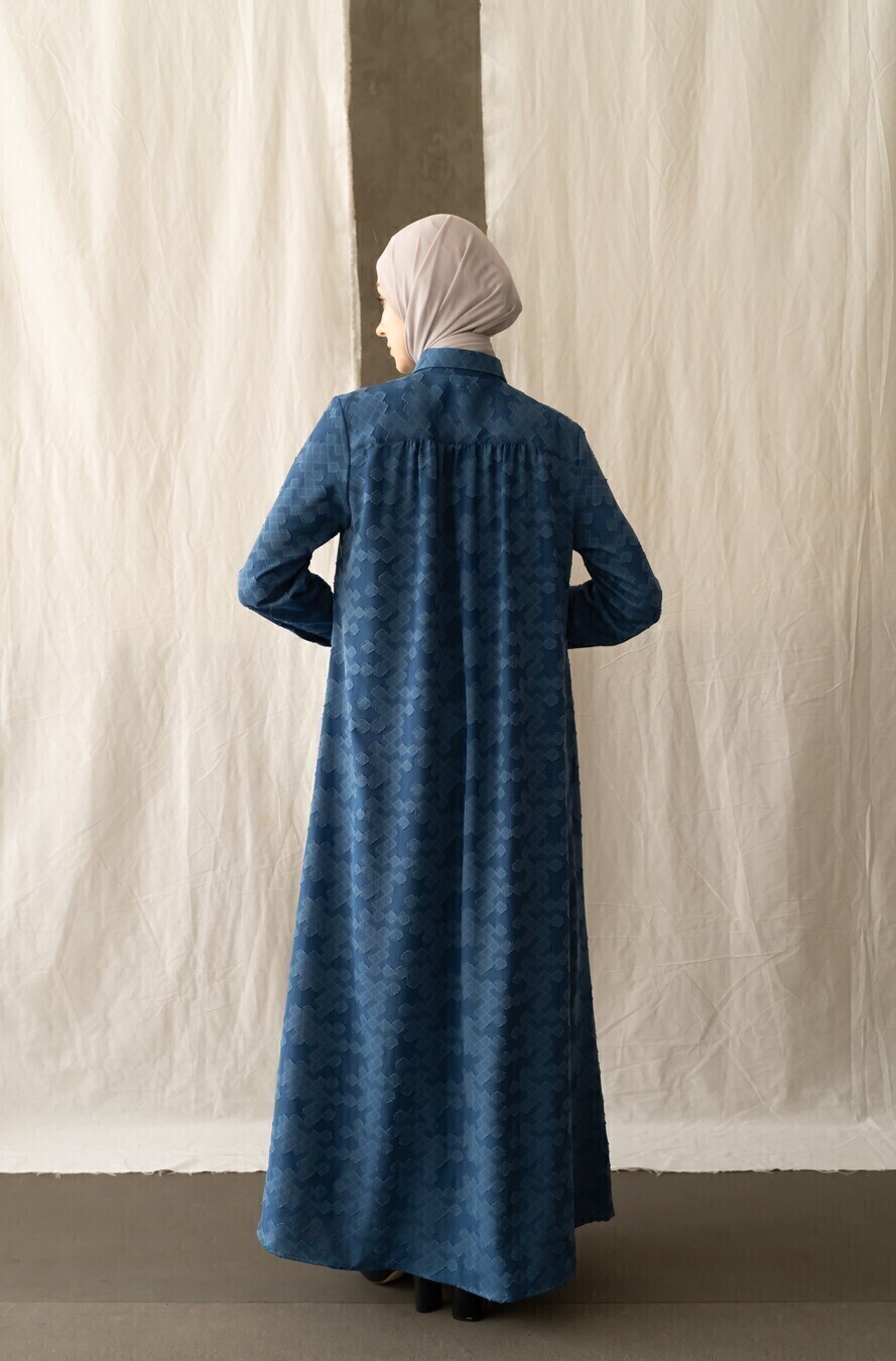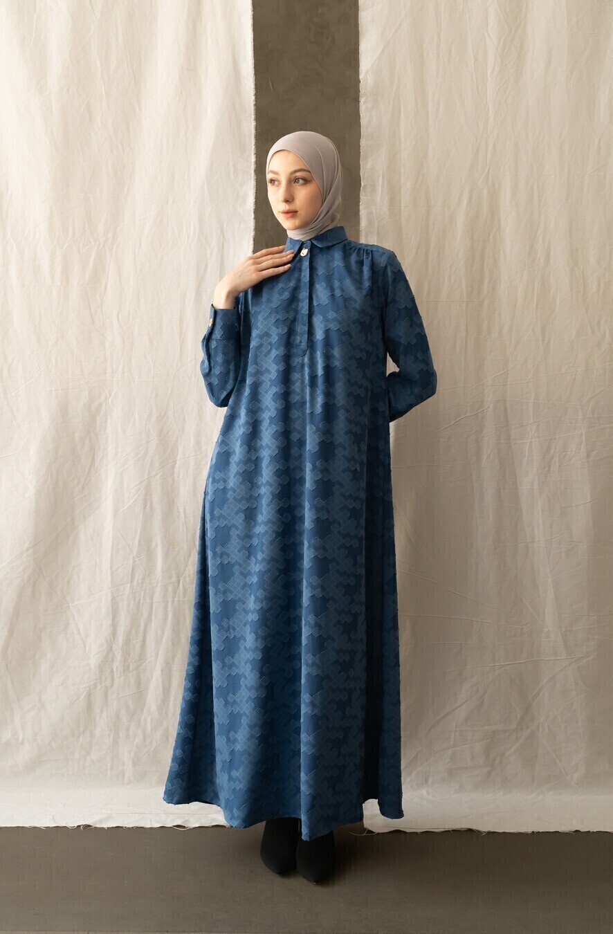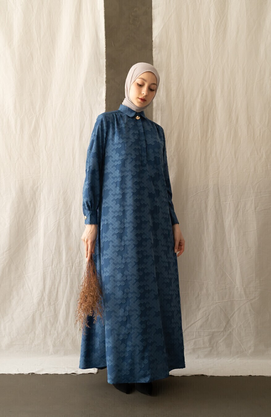 Material Kain Linen denim Jacquard dengan tekstur Uragiri unik, cutting dress A line dengan bukaan depan kancing sembunyi /hiden button, lengan wudhu friendly, silhouete feminine , terdapat saku sisip kanan, lipit depan dan belakang dengan detil kerah yang stand out.