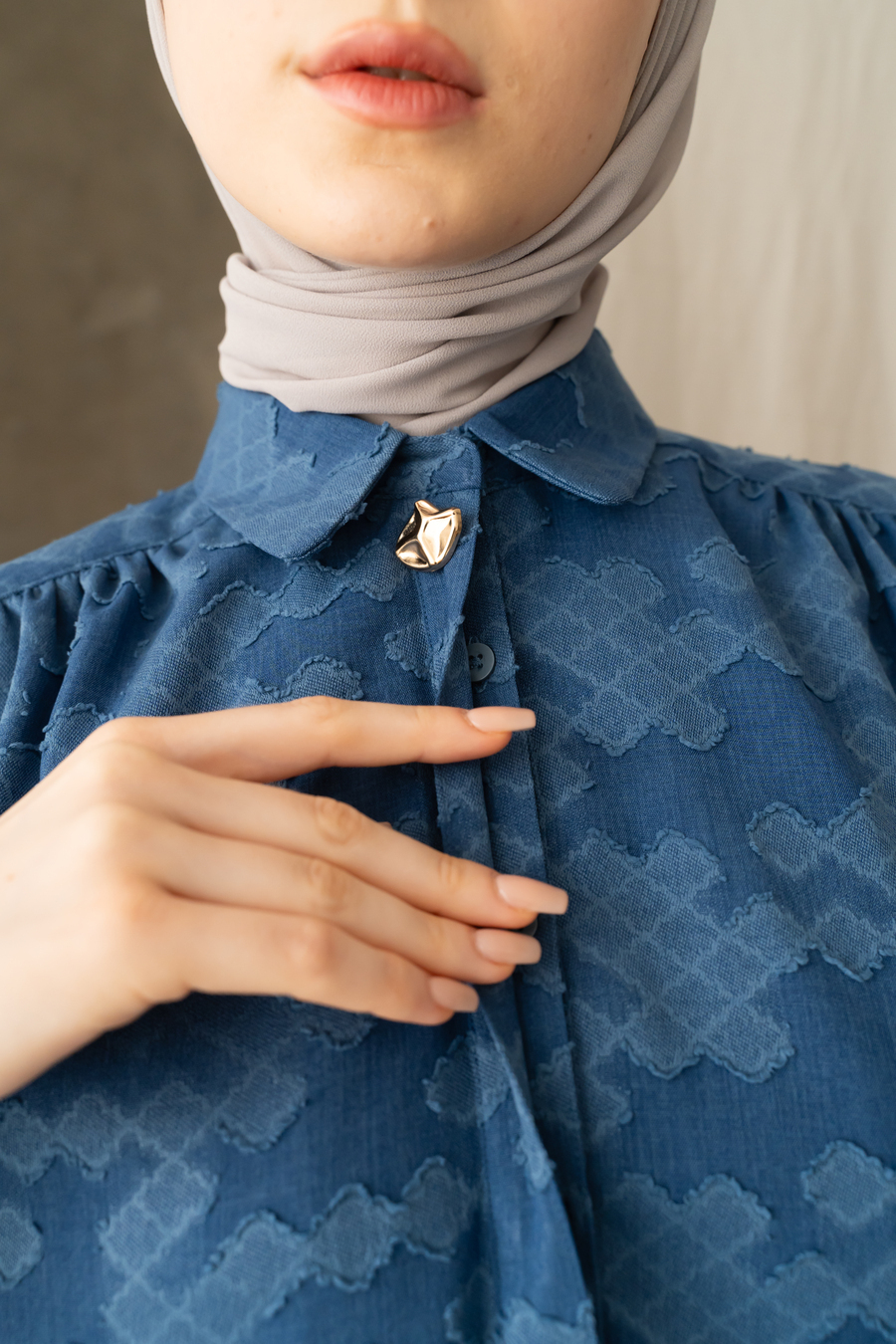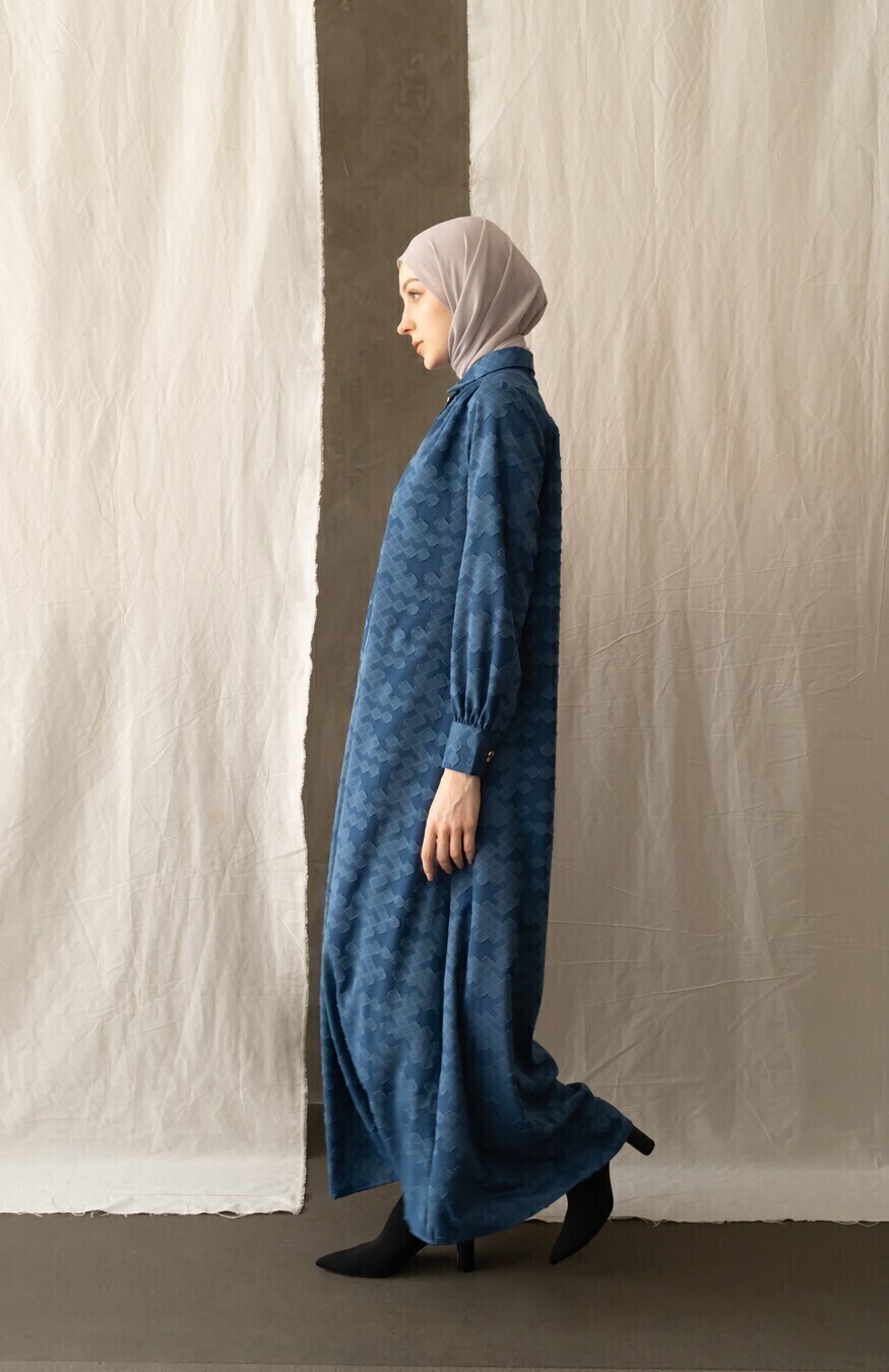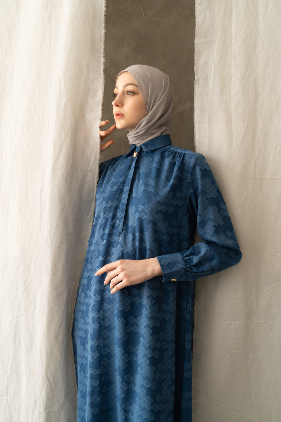 Material Kain Linen denim Jacquard dengan tekstur Uragiri unik, cutting dress A line dengan bukaan depan kancing sembunyi /hiden button, lengan wudhu friendly, silhouete feminine , terdapat saku sisip kanan, lipit depan dan belakang dengan detil kerah yang stand out.