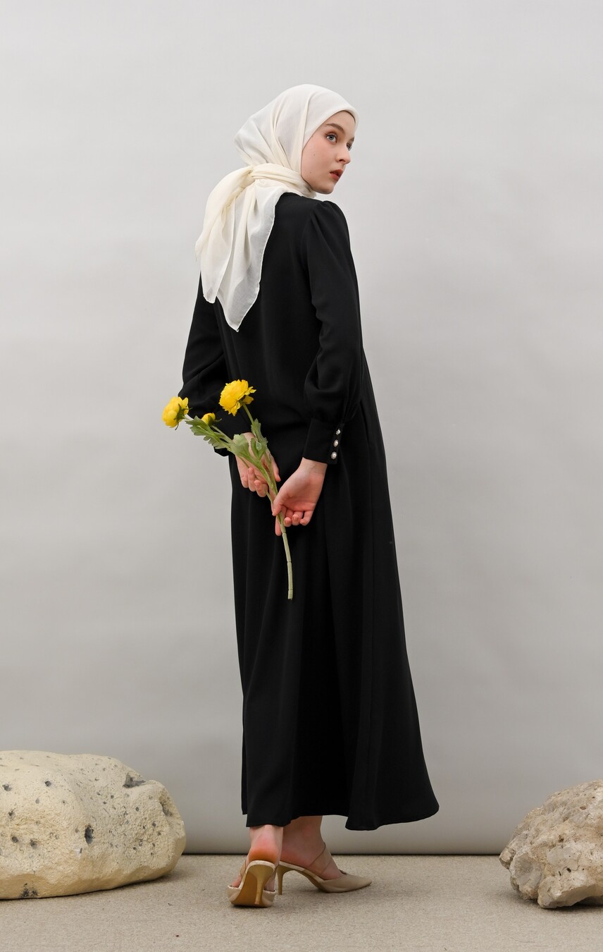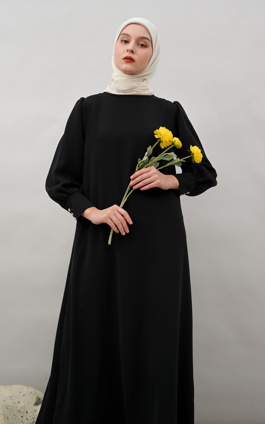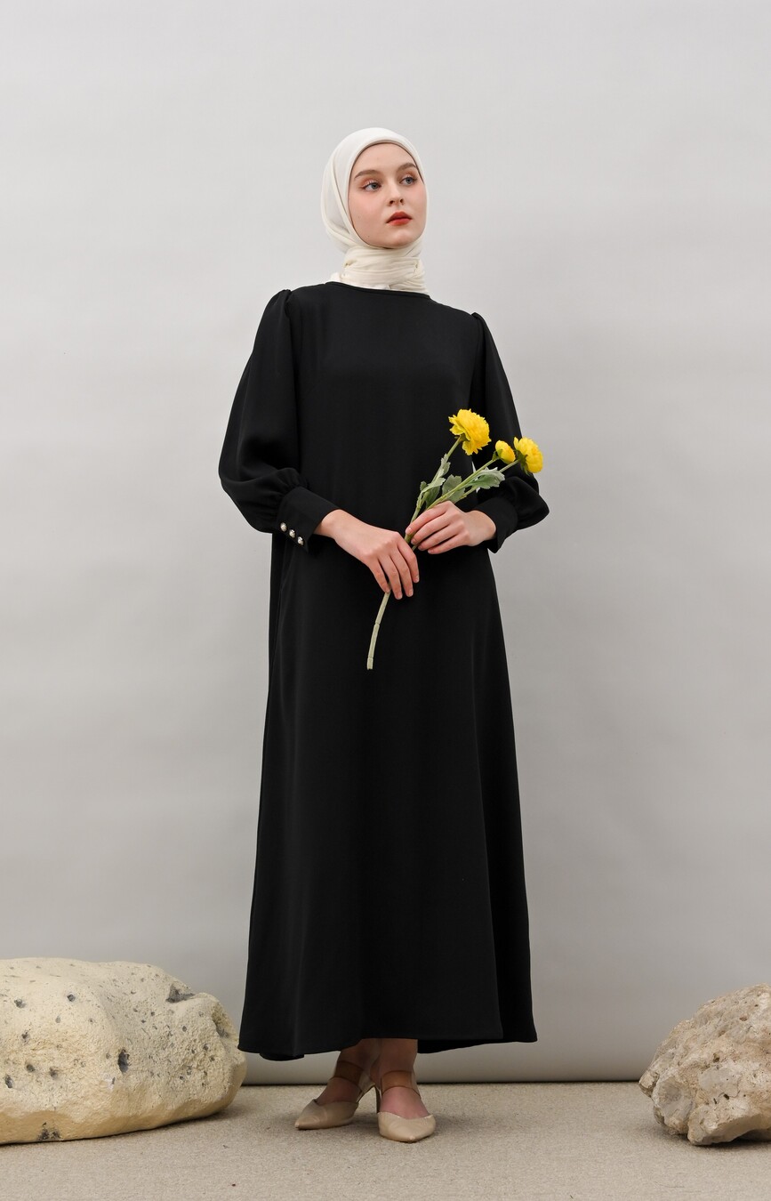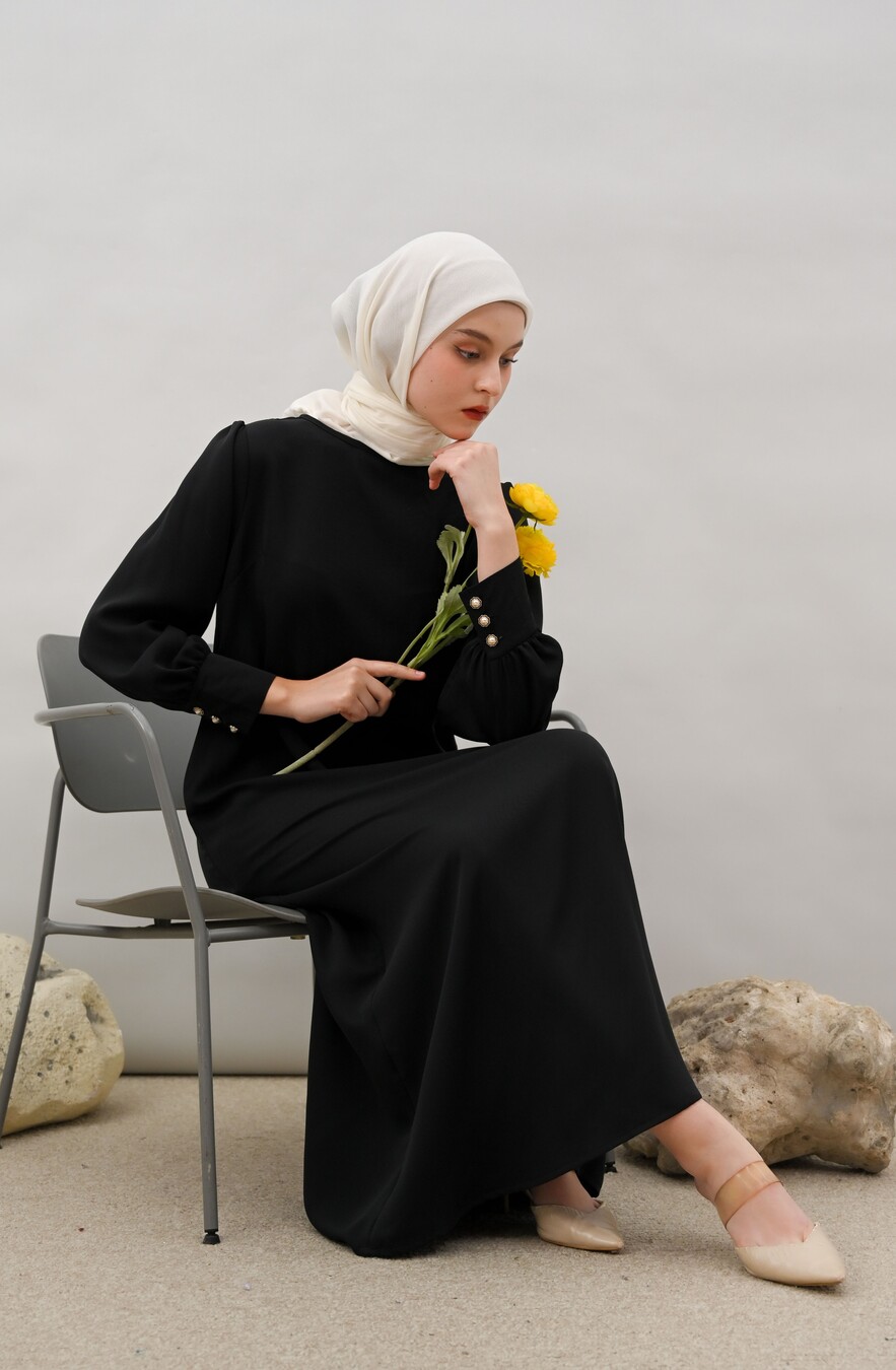Bahan premium royal crepe, bahan lembut , breathable, flowy dan tidak tembus pandang, kerah bulat simple dengan lengan detil kancing wudhu friendly, terdapat Saku SISIP bagian Kanan dress