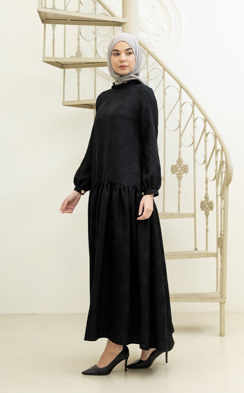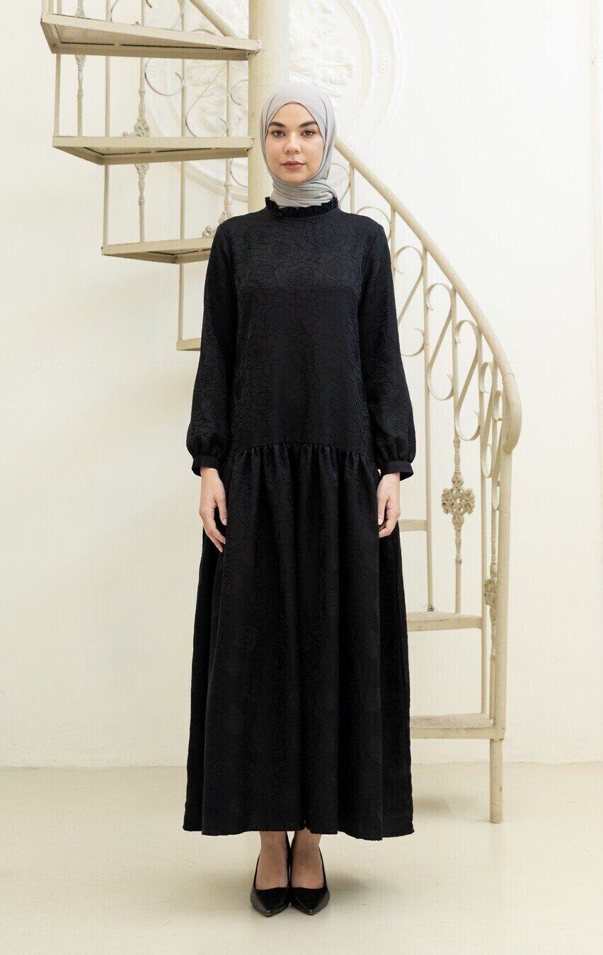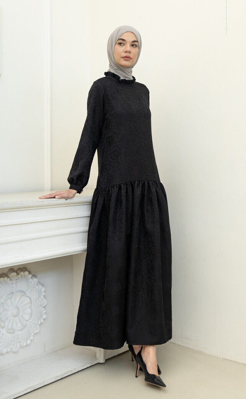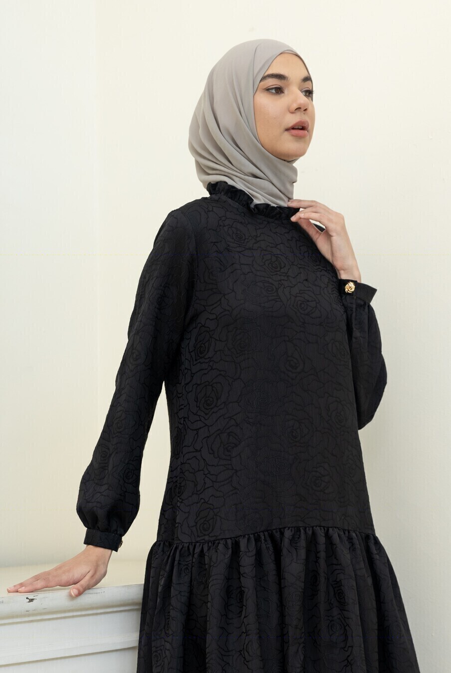 Bahan Jacquard High quality, lentur, flowy, permukaan bertekstur dengan motif bunga yang elegan, cutting dengan lipit keliling yg stand Out kesan feminine, definisi elegan, padu padan dengan sedikit bling bling untuk sentuhan mewah elegan ke acara resmi cakeeep, kesan humble tapi old money look dengan no effort. frills leher manis dengan seleting belakang, lengan wudhu friendly dengan kancing berkualitas unik bentuk rose berwarna Gold. kece.