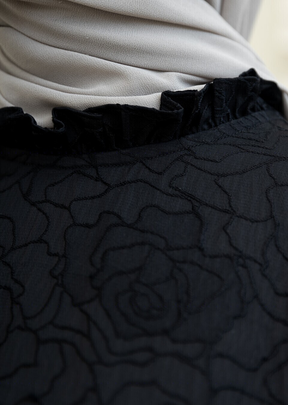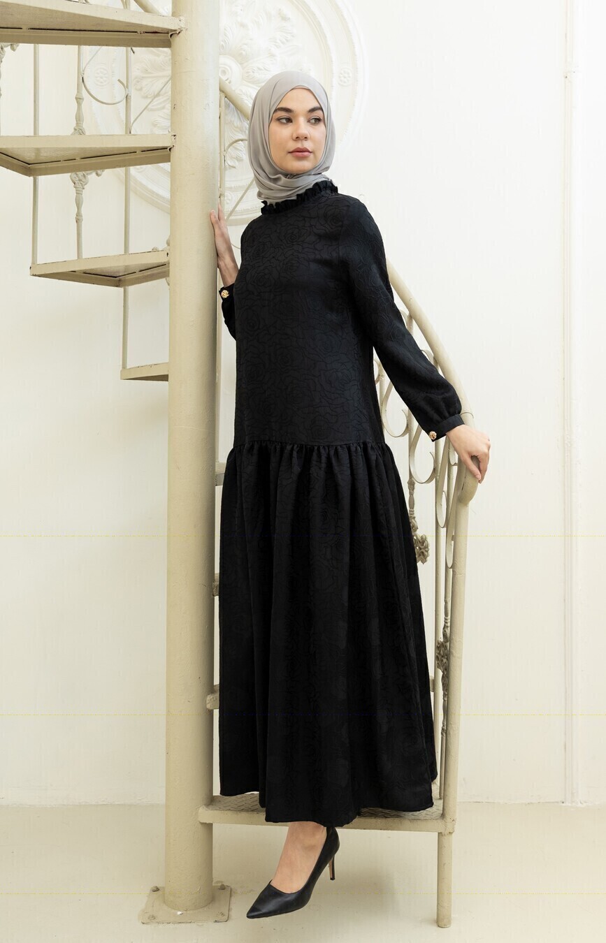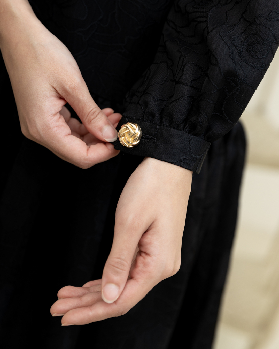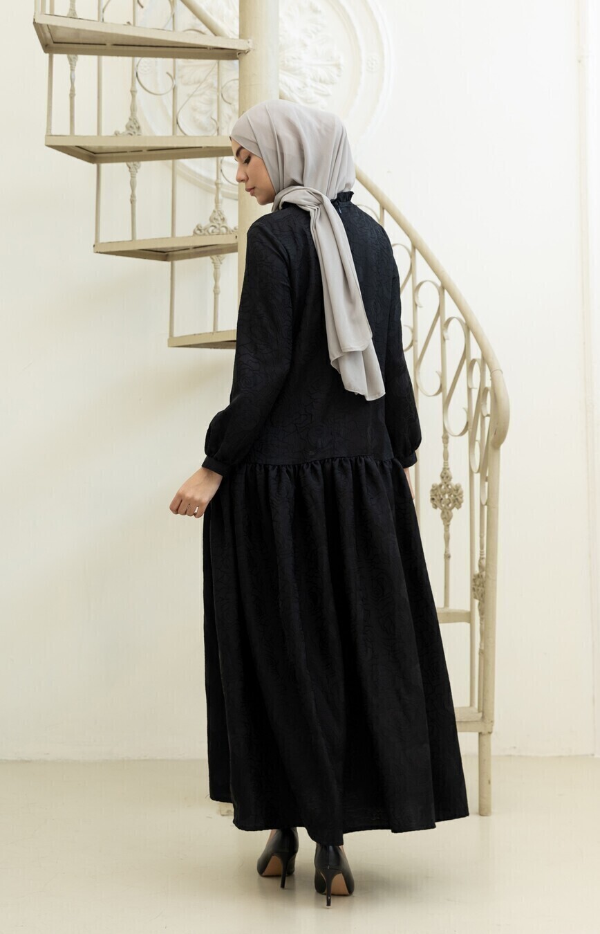 Bahan Jacquard High quality, lentur, flowy, permukaan bertekstur dengan motif bunga yang elegan, cutting dengan lipit keliling yg stand Out kesan feminine, definisi elegan, padu padan dengan sedikit bling bling untuk sentuhan mewah elegan ke acara resmi cakeeep, kesan humble tapi old money look dengan no effort. frills leher manis dengan seleting belakang, lengan wudhu friendly dengan kancing berkualitas unik bentuk rose berwarna Gold. kece.