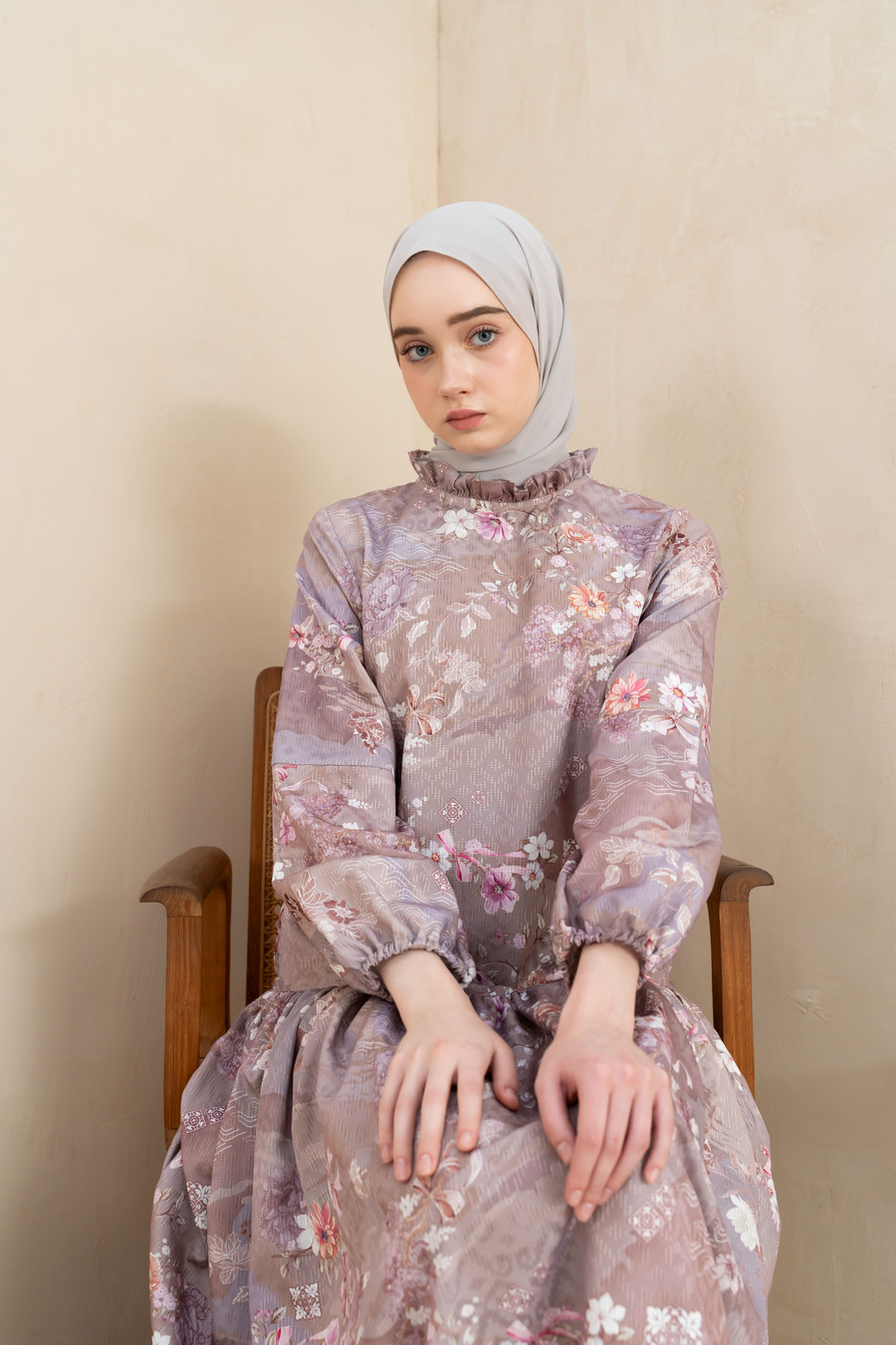 silhuet flowy manis feminine dengan cutting bawah lipit rapat , lipit ini pemakaian kain banyak ya supaya flowy elegan, lengan ujung berkaret pergelangan, wudhu friendly, resleting belakang, dengan pilihan size.