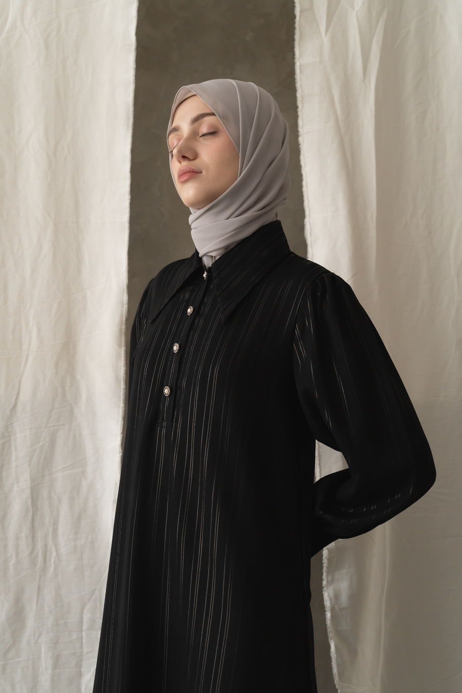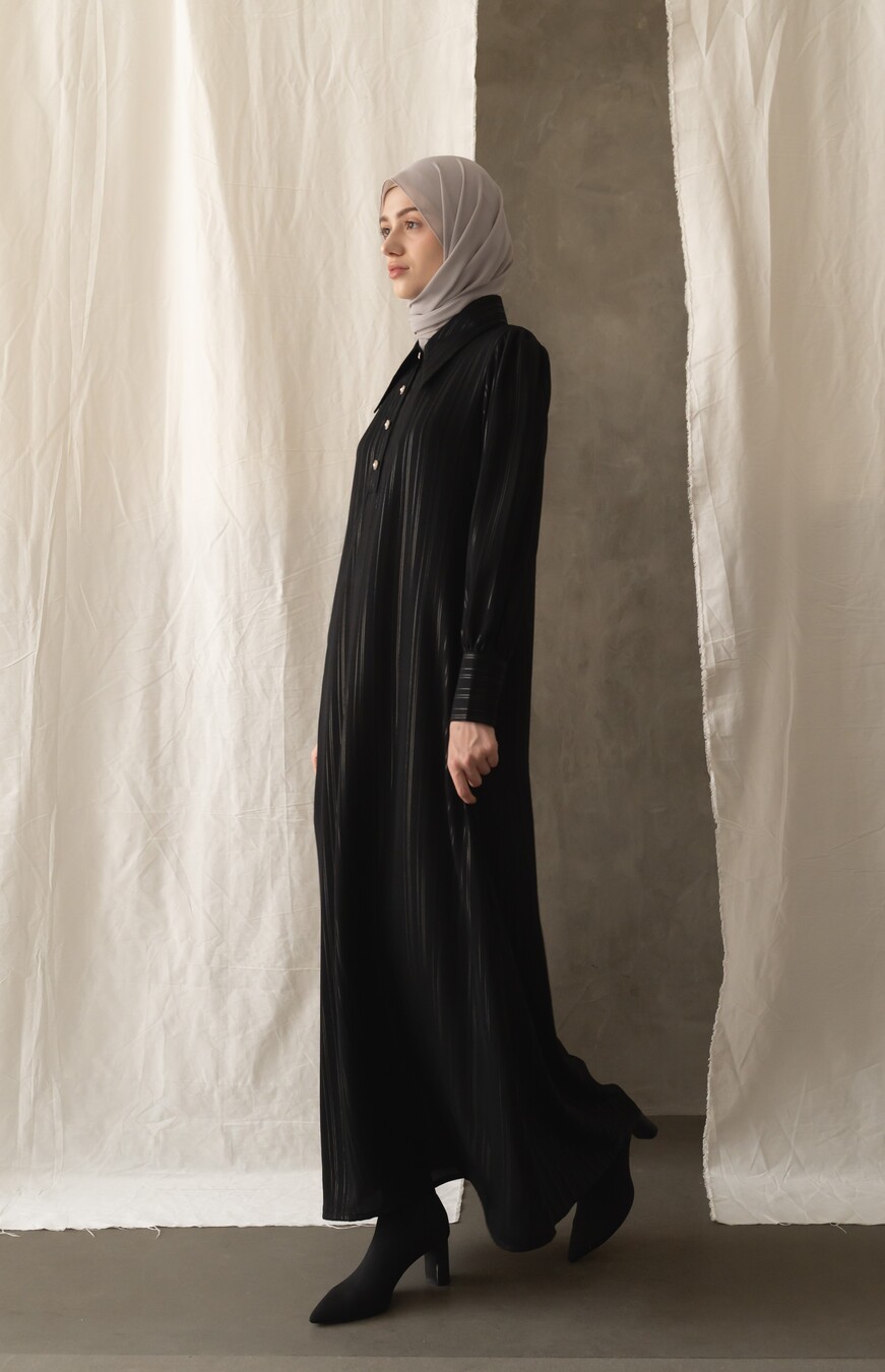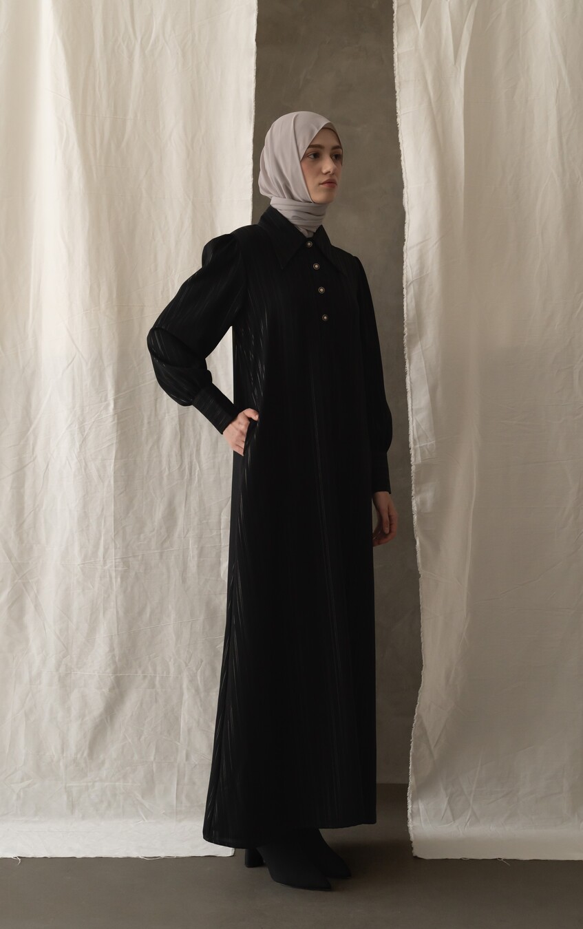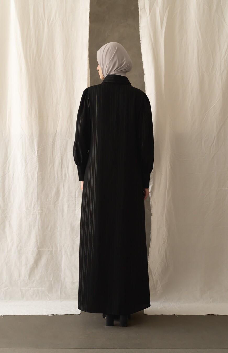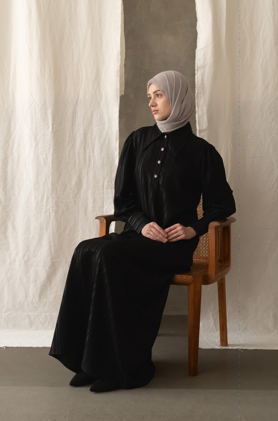 Bahan jetblack high quality, dengan motif benang silver salur yang mewah elegan, Cutting bikin slim jenjang look ini, ditambah Kainnya bagus banget, super nyaman , flowy dengan terkstur halus, tenunan kain rapat, tidak terawang yaa, buat safar super rekomended, buat ke kantor atau pesta elegan bangeet, daily juga bagus, di kain tenunan mix benang silver elegan mewah stripe vertikal, aslinya mewah elegan ini, Saku sisip kanan Dress dengan Puff pundak elegan, kancing lengan statement of Classy yg kece bisa dibuka semua. jenis kain ringan , BEST bangeet.