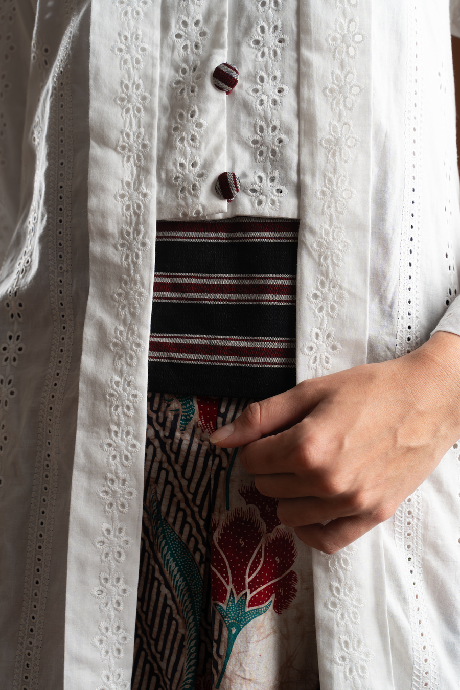 Bahan Katun Bordir pure Cotton dengan motif embroidery manis unik dan kece, eyelet motif bunga, adem dan sangat breathable, kutubaru INCLUDE dengan OBI aksen kece kain tenun ATBM hand made asli, lurik stripe manis senada bisa lepas pasang, ada hidden kancing di dalam bisa lepas jika mau tampilan beda, kancing kutubaru HIDUP bisa dibuka,