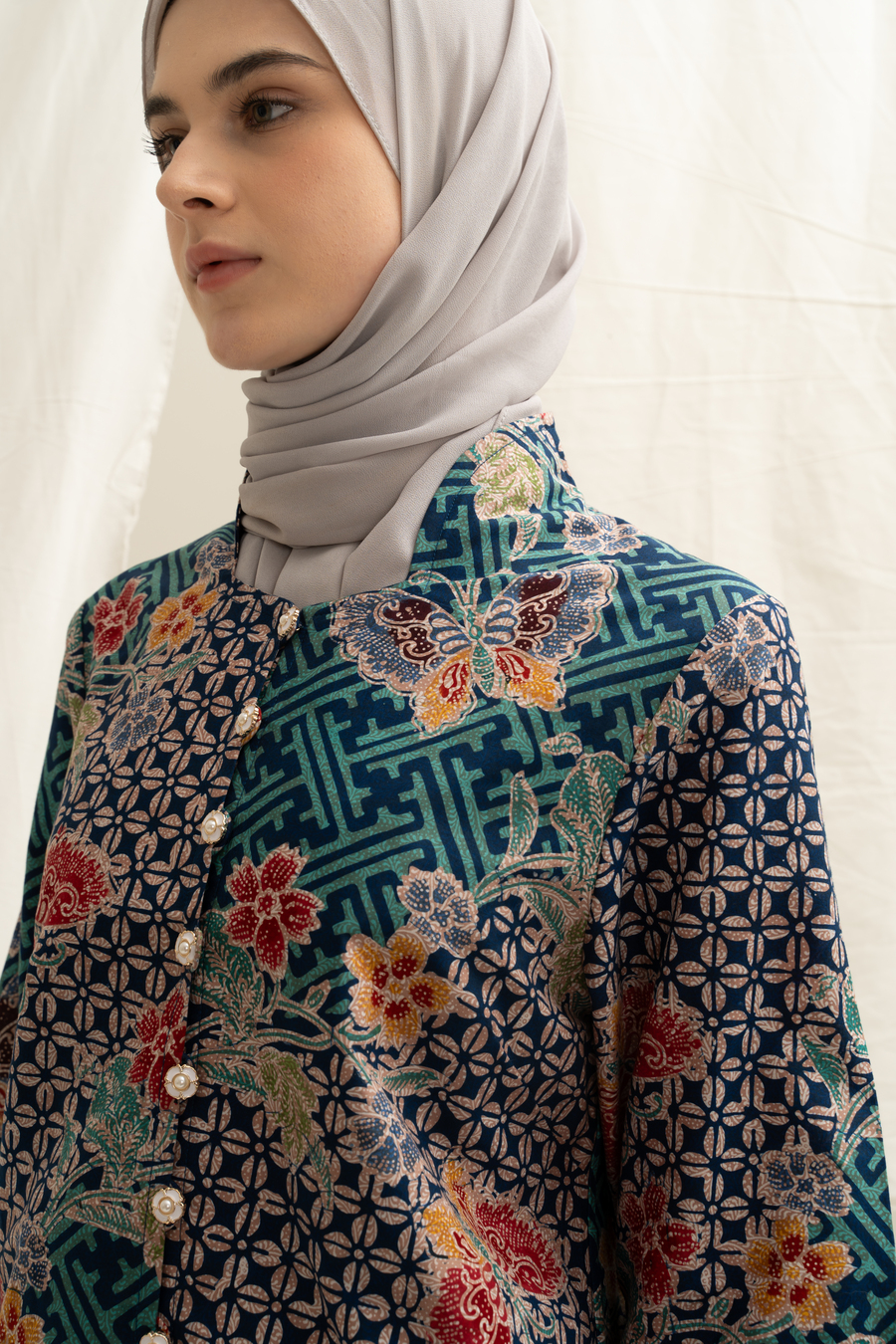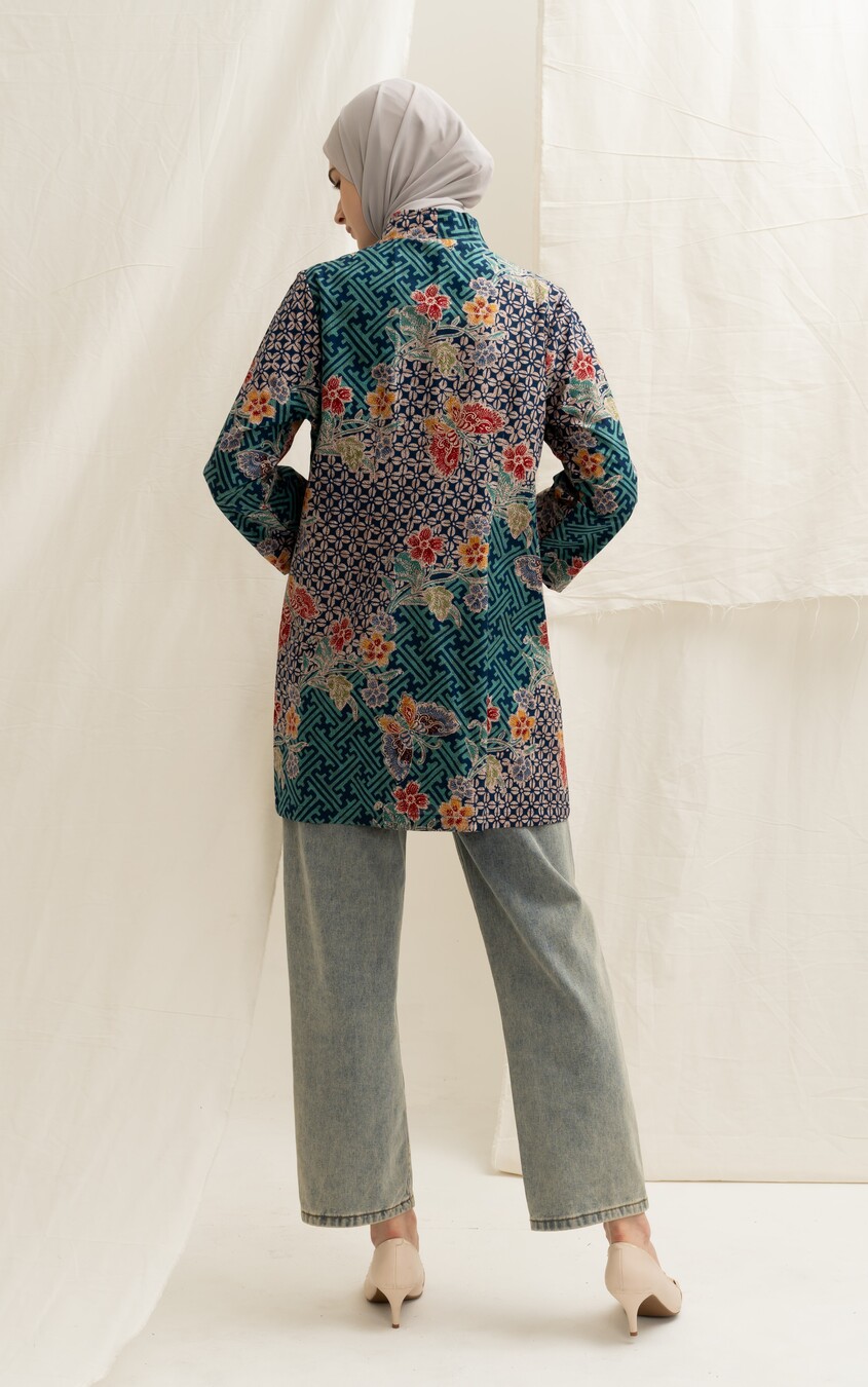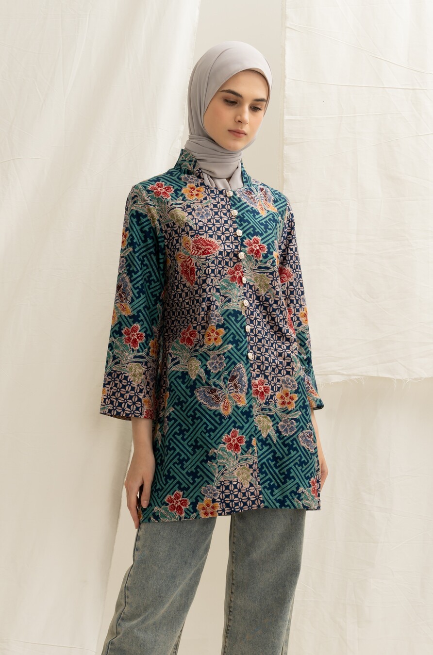 Bahan Batik KATUN diproses batik kombinasian Tulis tanahan , dengan lapisan lining halus di body, silhoute kebaya bagian kerah dengan detil manis, kancing bukaan depan hidup semua, slim cutting dengan panjang lengan sampai pergelangan lengan , Model Bule Tinggi 175 jadi terlihat kurang ujung, body asia akan sepergelangan ya.