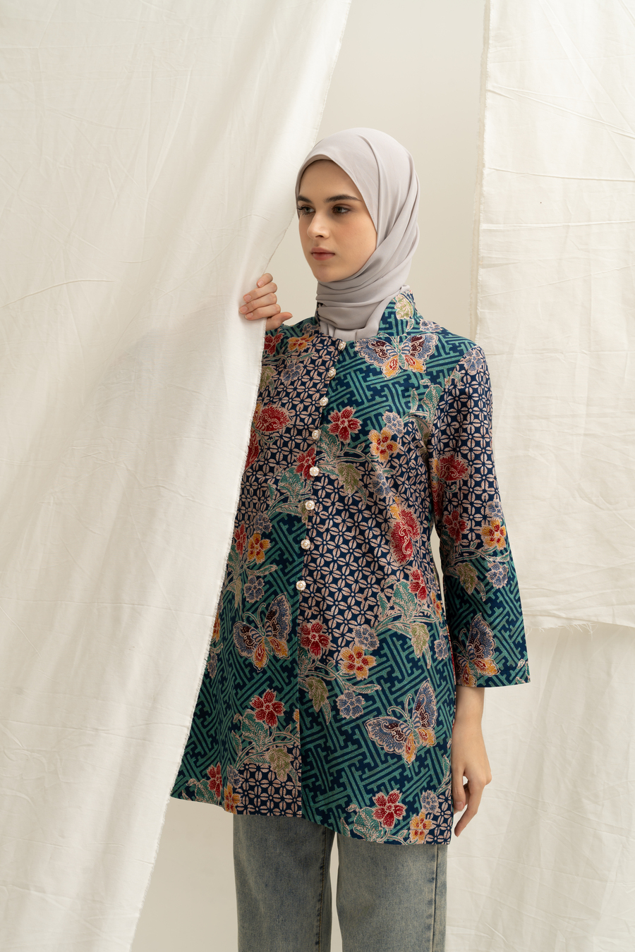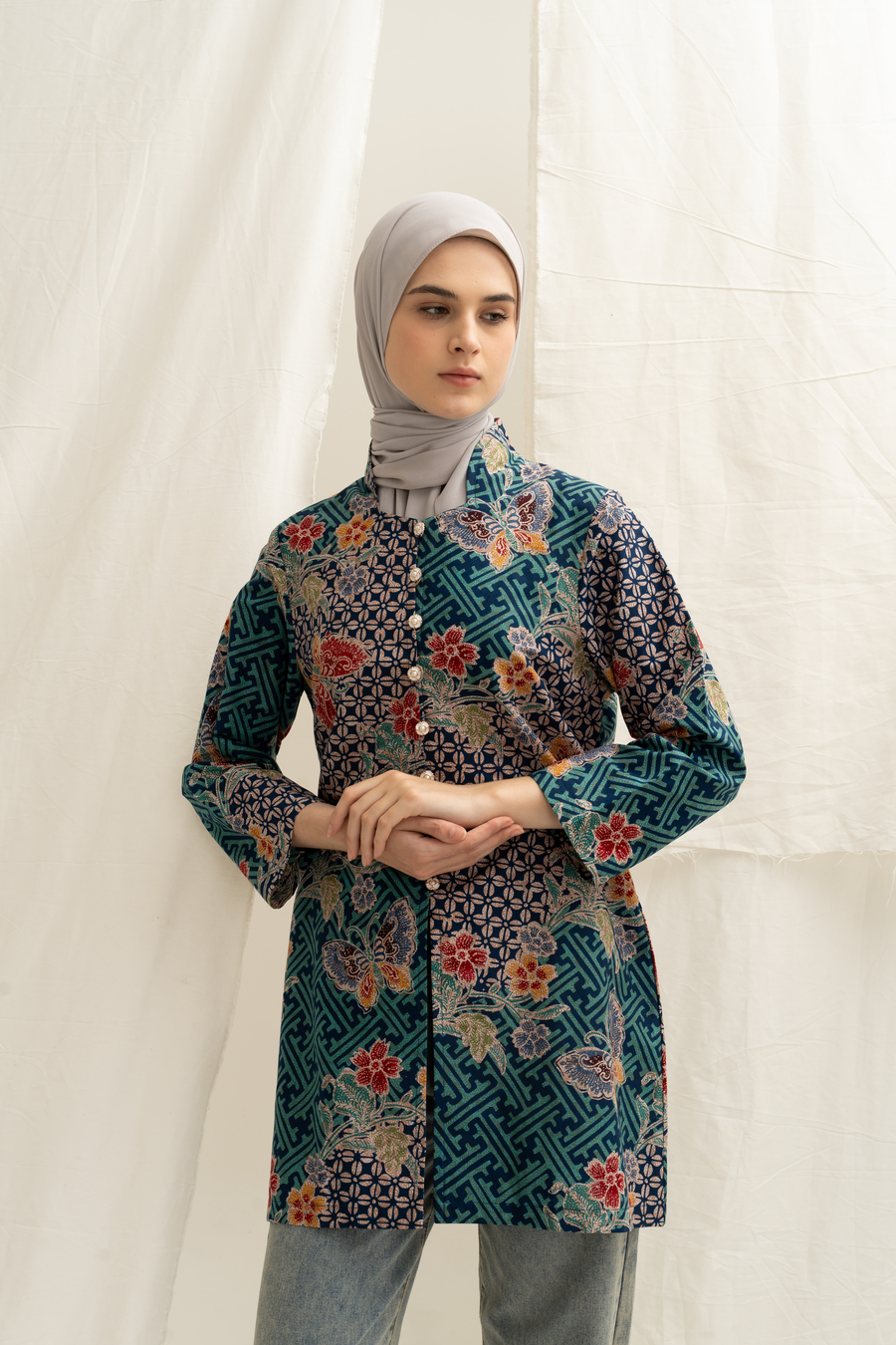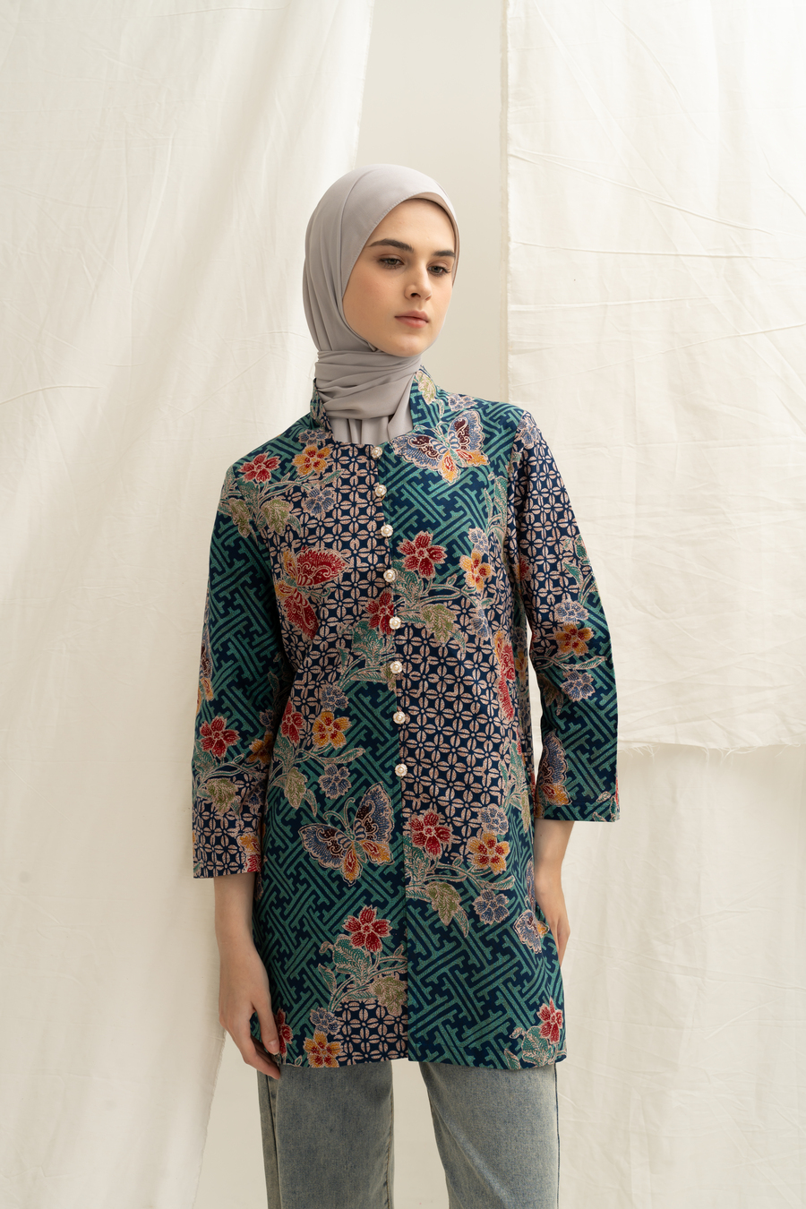 Bahan Batik KATUN diproses batik kombinasian Tulis tanahan , dengan lapisan lining halus di body, silhoute kebaya bagian kerah dengan detil manis, kancing bukaan depan hidup semua, slim cutting dengan panjang lengan sampai pergelangan lengan , Model Bule Tinggi 175 jadi terlihat kurang ujung, body asia akan sepergelangan ya.